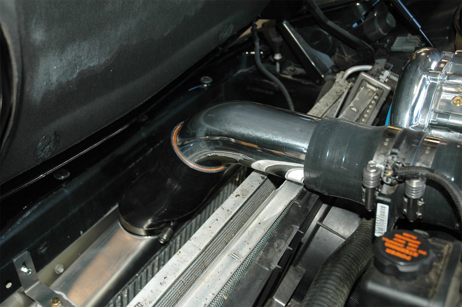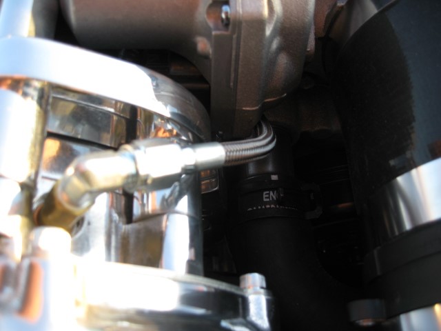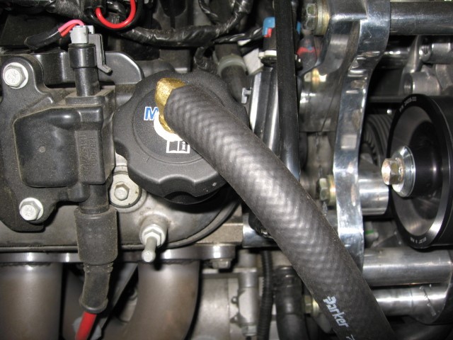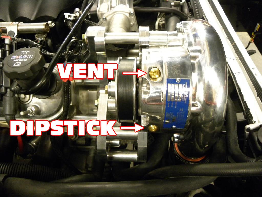 The preferred method of draining the oil from the supercharger to the sump is by cutting and tapping a 3/8” pipe fitting directly into the front of the oil pan.