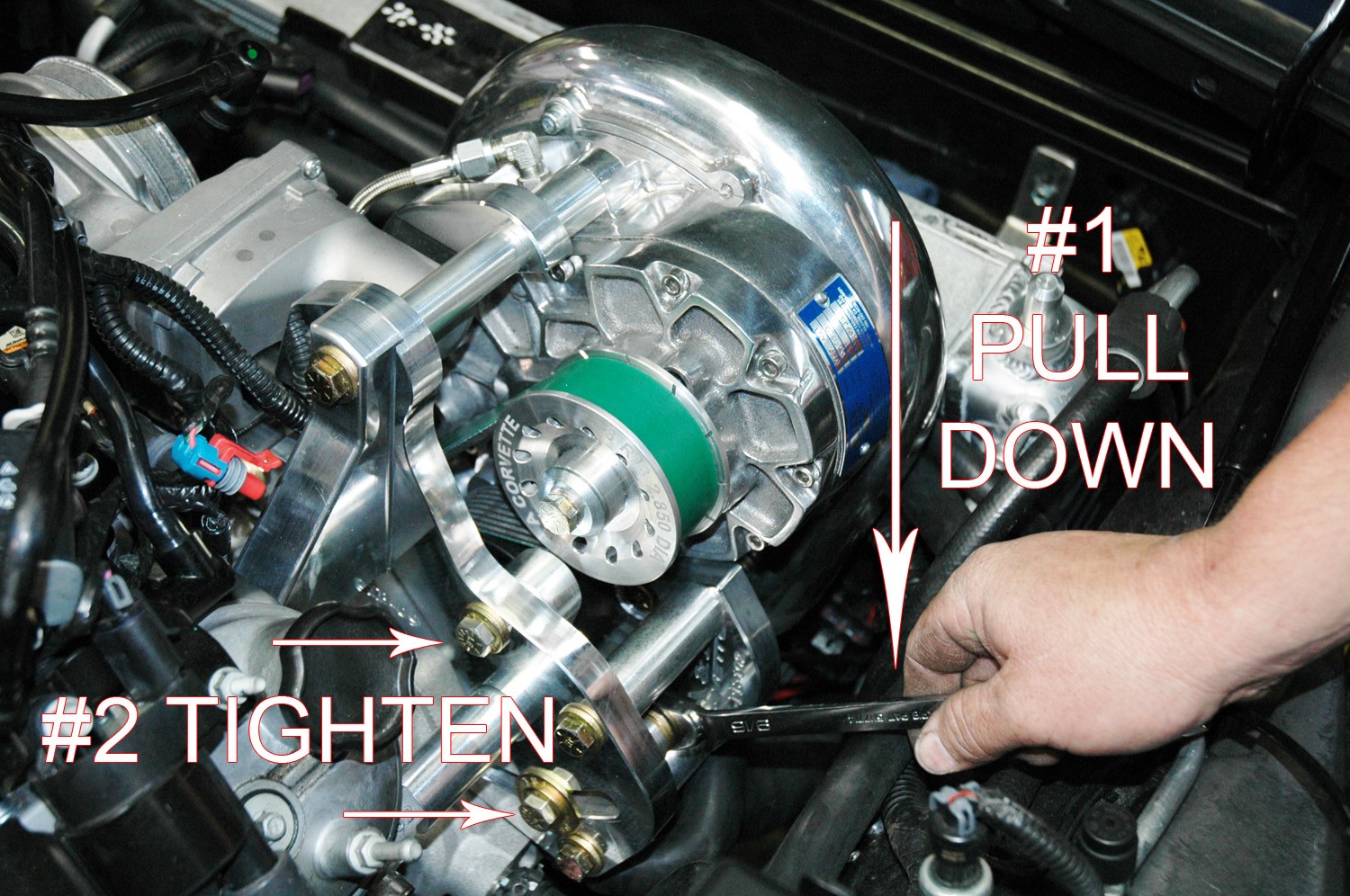 On V1, V2, and V7 models ONLY, you will need to connect the oil drain line to the supercharger before mounting it to the bracket. We use stainless AN line and it is extremely tight in this area. The line MUST be oriented as shown in the picture to avoid contact with the tensioner. Double check this clearance after the installation is complete.